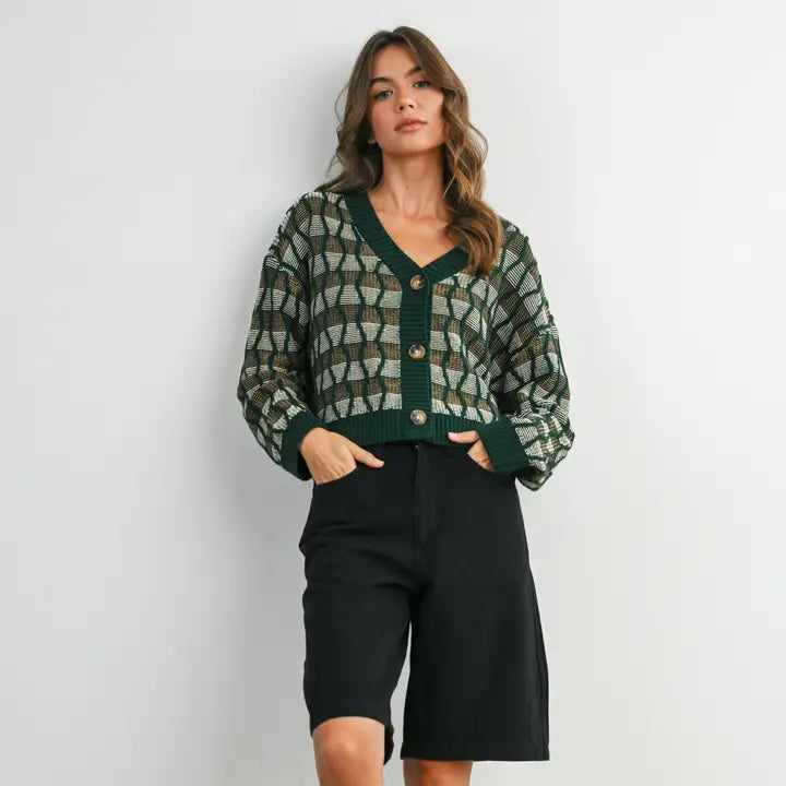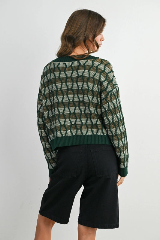 Elevate your everyday look with this Geometric V-Neck Button-Down Long Sleeve Top. Featuring a striking geometric print, a flattering V-neckline, and button-down front, it combines style and comfort effortlessly. Perfect for both casual and polished outfits.